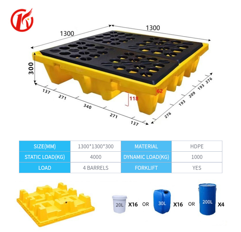 This 4-drum spill containment pallet is made from high-quality, chemical-resistant polyethylene (PE), providing a reliable and durable solution for safely storing and transporting hazardous liquids.