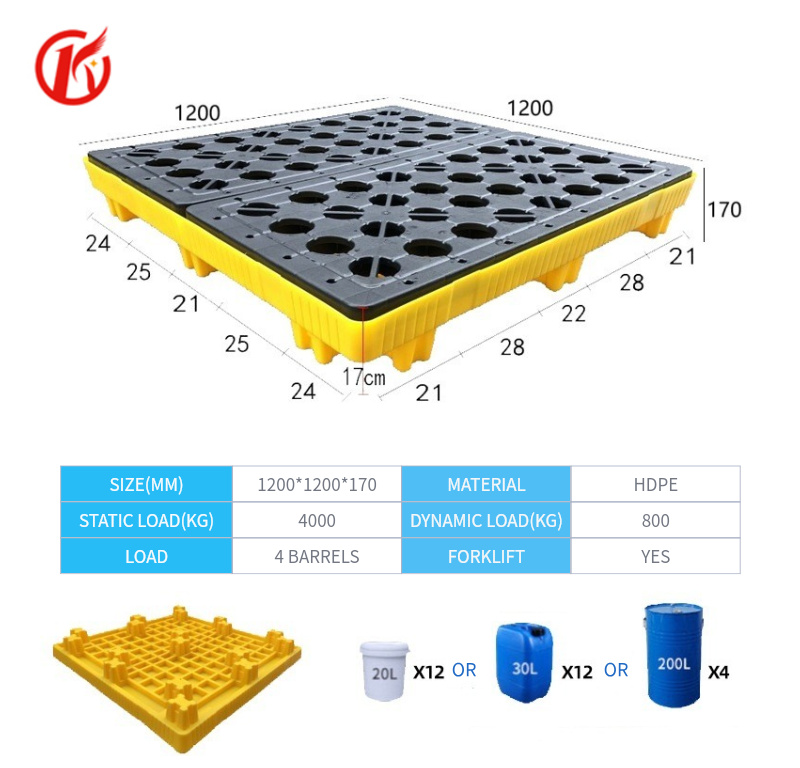 This 4-drum spill containment pallet is made from high-quality, chemical-resistant polyethylene (PE), providing a reliable and durable solution for safely storing and transporting hazardous liquids.